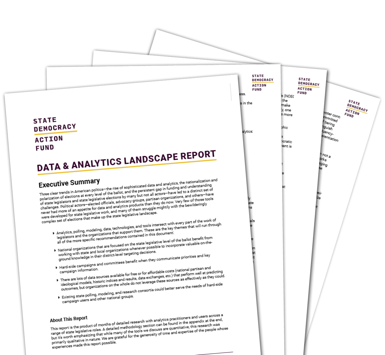 Over the last year, SDAF conducted a research project focused on the importance of data and analytic tools at the state legislative level. Civic actors – elected officials, advocacy groups, and others – have never had more of an appetite for data and analytics products than they do now. Analytics, polling, modeling, data, technologies, and tools intersect with every part of the work of legislators and the organizations that support them. SDAF wanted to better understand the challenges at the state legislative level and provide recommendations for the broader ecosystem. Findings from this project can be found in this report.